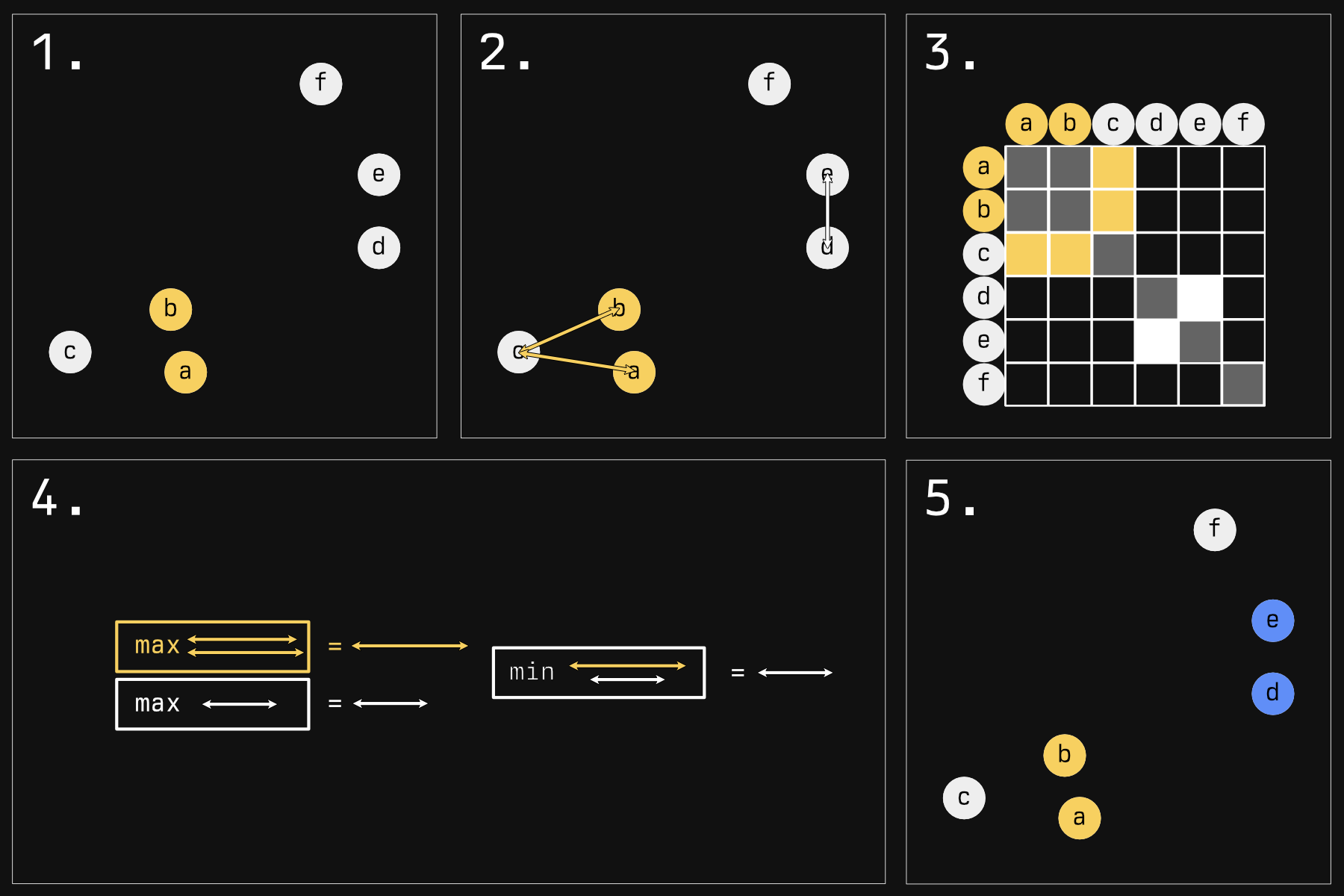 This strange 'minimum of maximums' tends to keep clusters compact: If their farthest bits stray too far away from their next member, they probably won't get added to the herd. If you kept going, you'd get something like this: