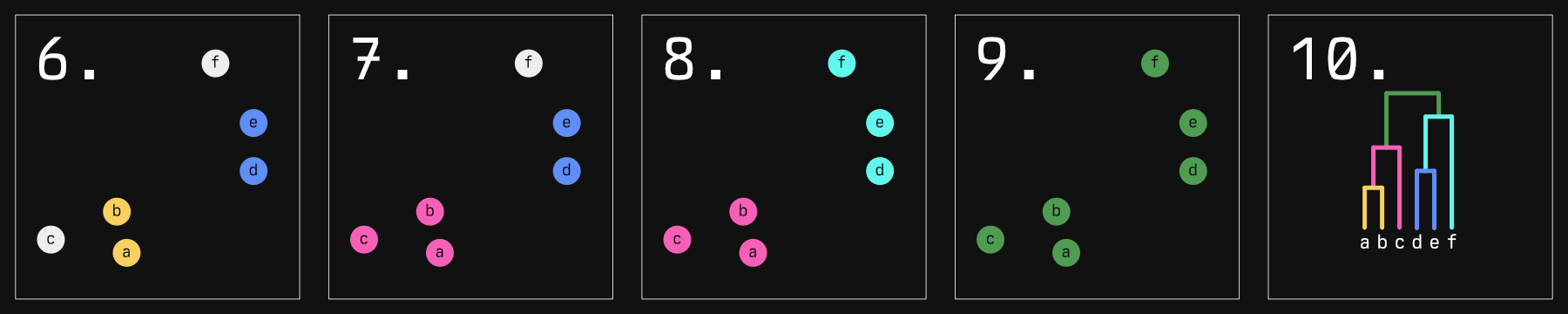 Below is an illustration of what happens during the second phase, the agglomeration. In this stage, individual samples form groups, one sample at a time, forming progressively larger blobs.