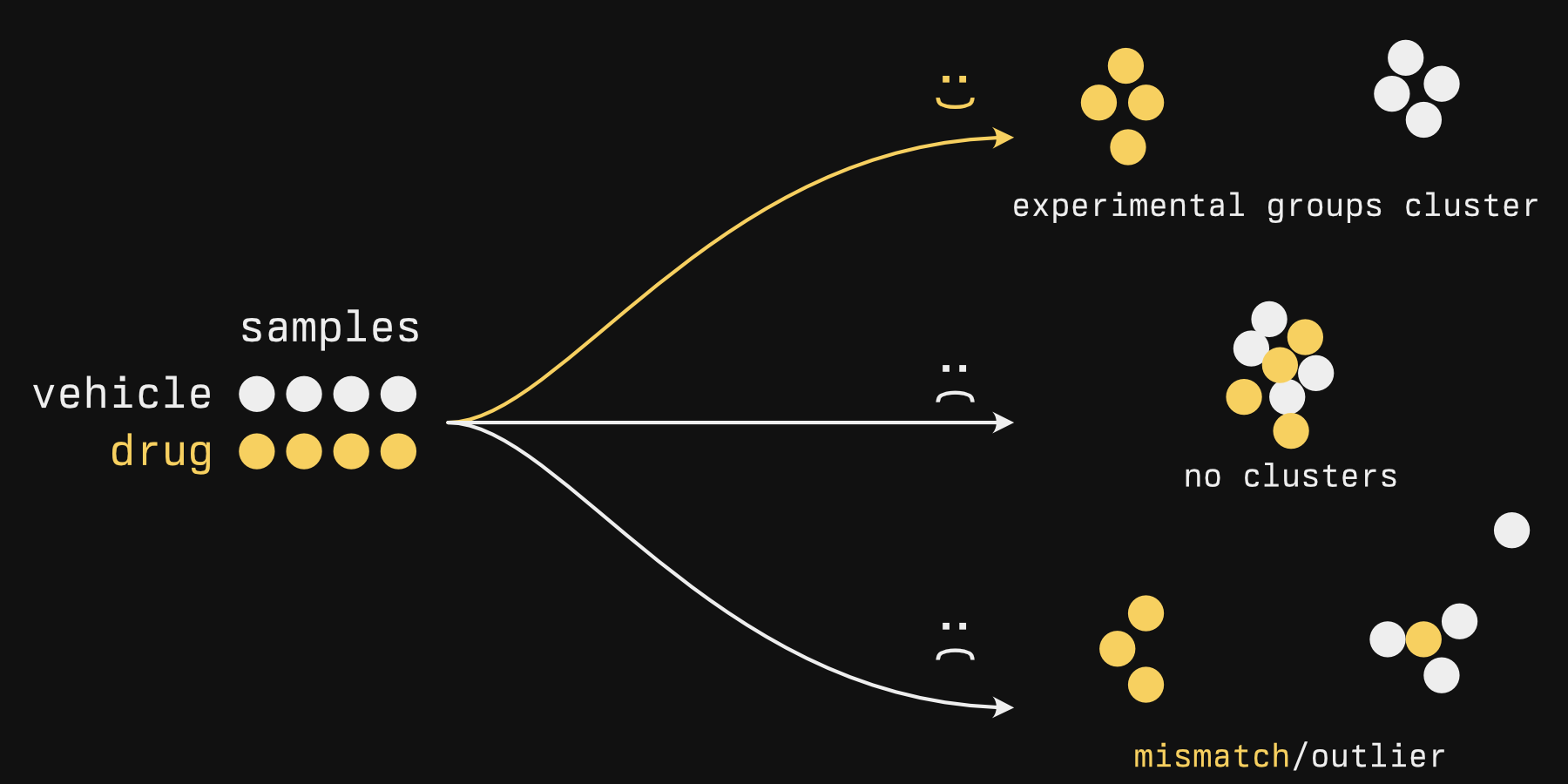 - Quality assurance. Like-condition samples should group with one another, without revealing which sample belongs to which group. It's a bit like blinding in a clinical trial: the clustering algorithm is blind to group membership, it just shows the groups that seem to appear in the data, and you pray to whatever deity that your expected groups and its groups are the same.